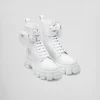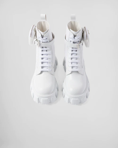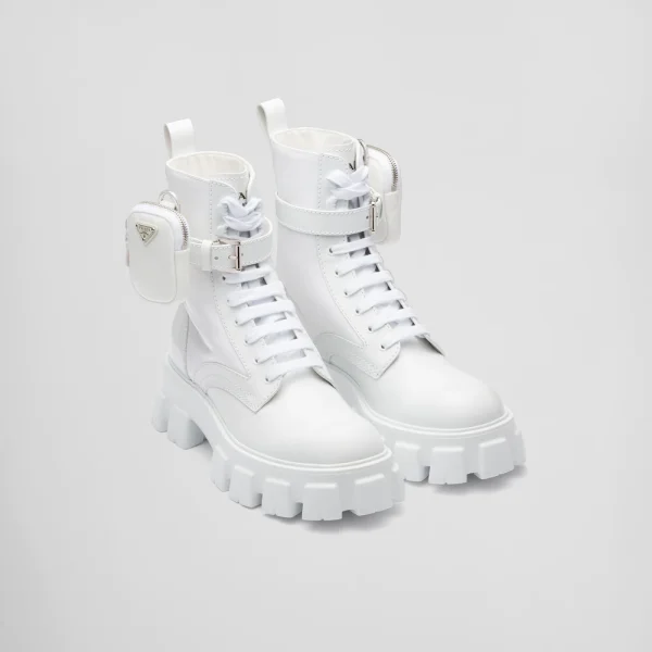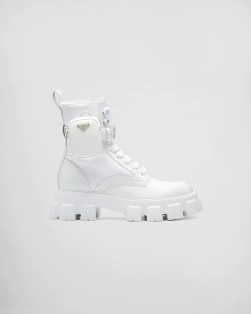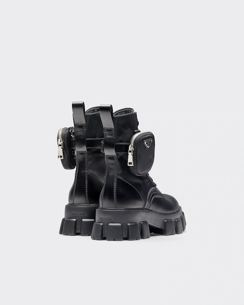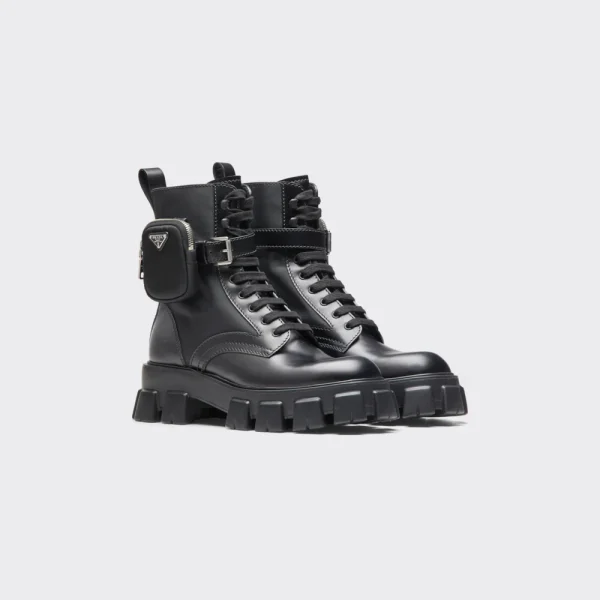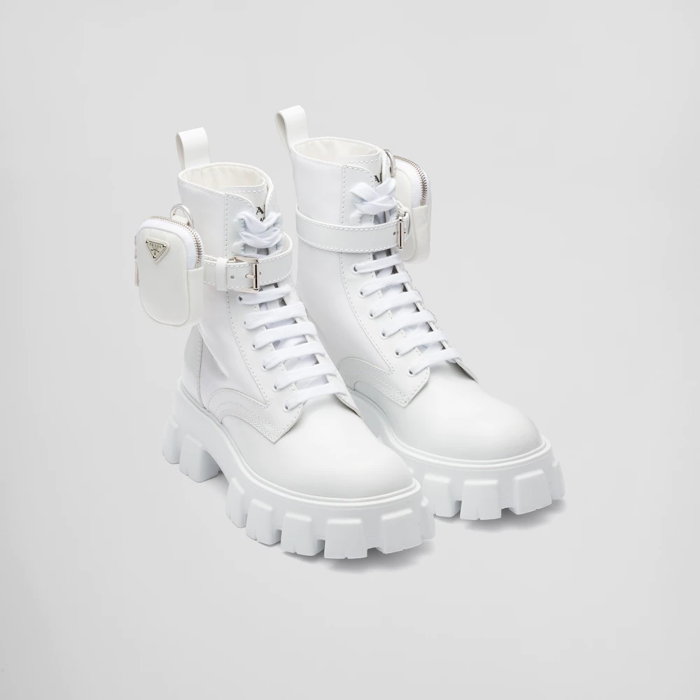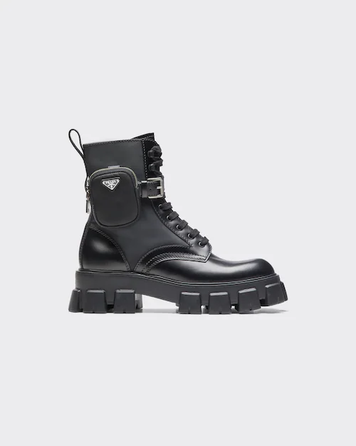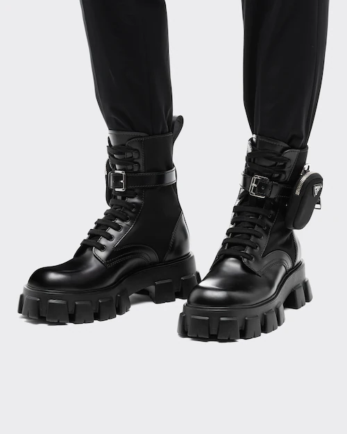 These brushed leather and nylon boots are decorated with a versatile pouch that recalls a multi-pocket design. The formal rigor of the uniform inspires this shoe, an expression of a timeless design, monolithic and unique, that reinterprets the dual soul of Prada from a modernist perspective. The maxi sole that defines the bold lines of Monolith footwear is combined with elegant brushed leather, emphasizing the brand’s desire to create harmony through diametrically opposed hybrid concepts.